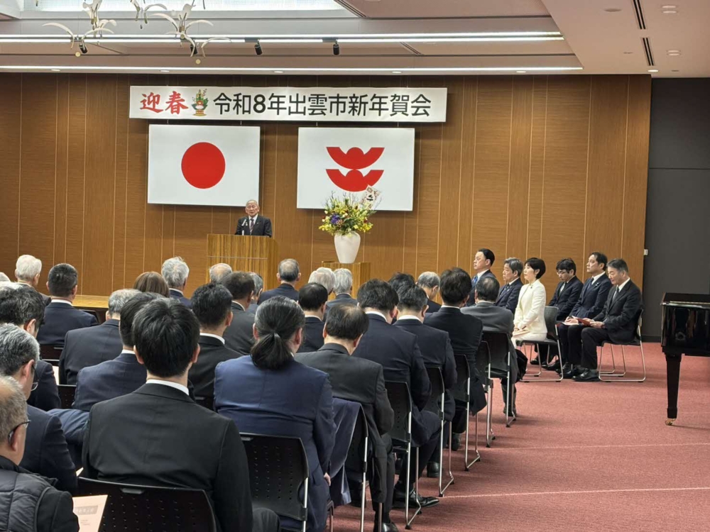 令和8年(2025)1月5日(月)に、出雲市新年賀会が開催され、出雲市議会から伊藤議長、大場副議長が出席しました。新年の幕開けにあたり、市政の発展と地域の更なる飛躍を祈念しました。 令和8年出雲市新年賀会(R8.1.5)